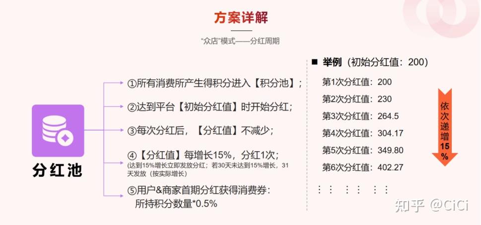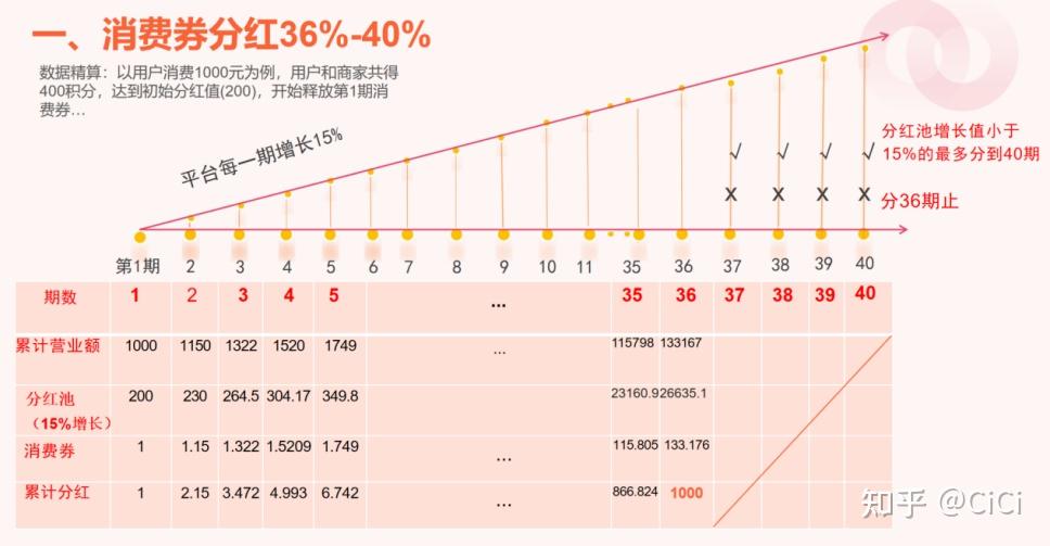 分红逻辑 :平台设有初始分红标准,所有商家让利部分进入奖金池。奖金池初次达到 10 万即进行首次分红,按照积分数量释放,释放比例为 0.5%。首次分红后,若业绩达到 15% 的增幅即开启下一期分红;若 30 天内未达到增幅,也会自动分红一次。