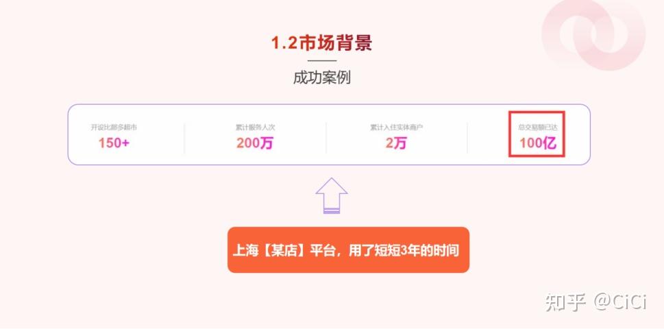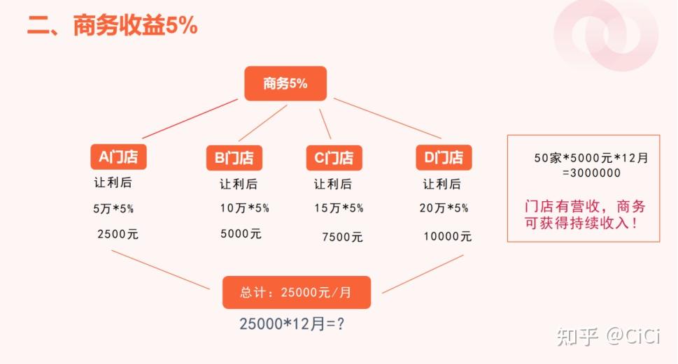 举例:若商务用三个月时间招商入驻 100 家商家,按照平均商家日流水 1 万计算,每月的佣金为:100 × 1 万 × 365 × 20% × 5% = 3.65M。即使仅招商入驻 10 家,流水减半,每月佣金也有十几万。