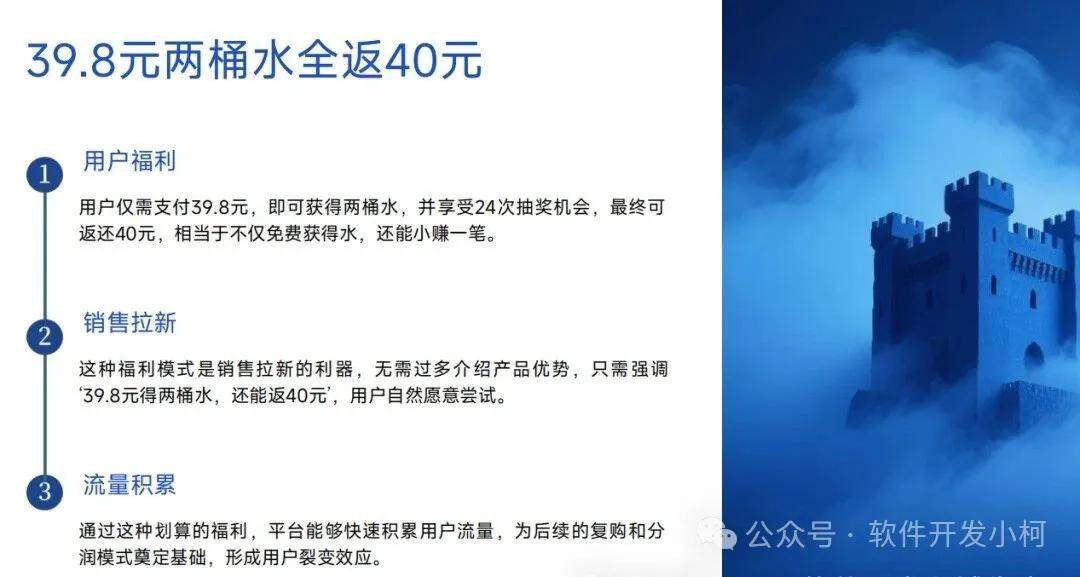 产品成本:保守估计≤0.4元/瓶(批量采购) 配送成本:3元/件(站长层级) 综合成本:单件水成本≈9-12元 售价:39.8元/件(首单),复购19.9元/桶