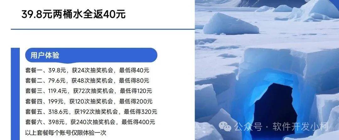 抽奖次数 = 购买件数 × 30次 返现总额 ≥ 支付金额(保证用户Zui终全额返还) 示例:套餐一支付39.8元,获得30次抽奖机会,Zui低返还40元