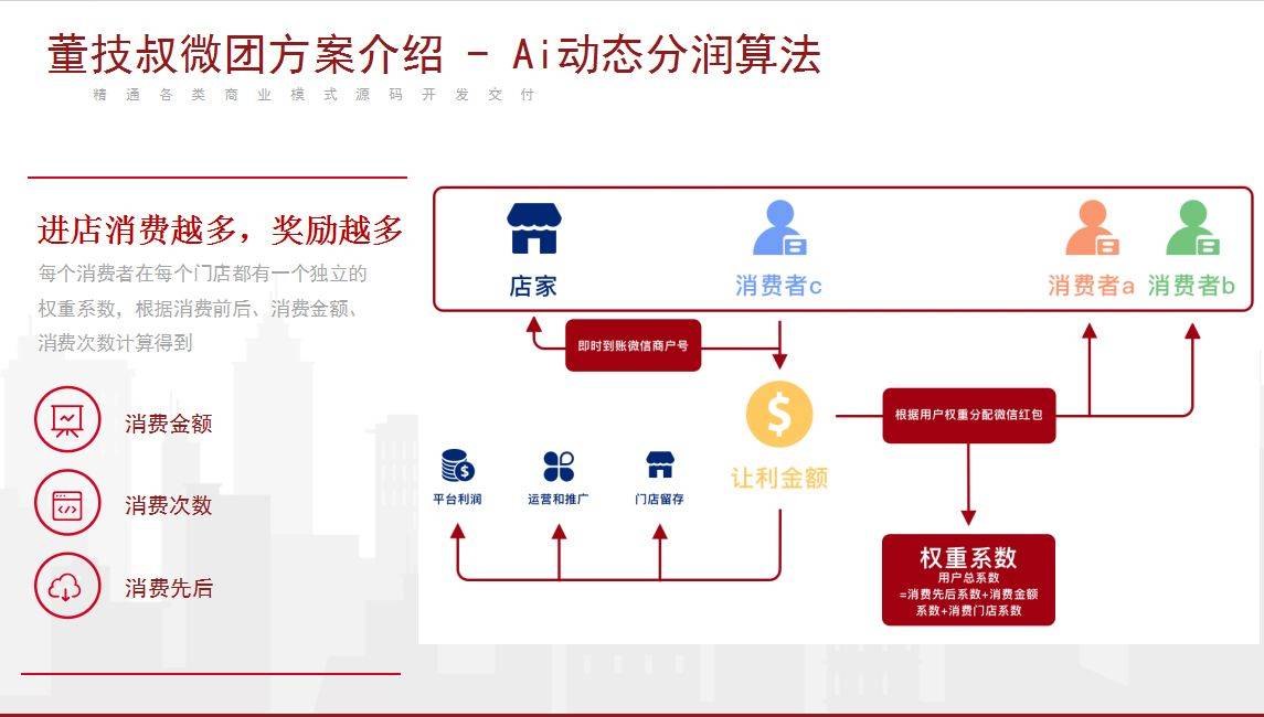 2、AI智能分配:按“贡献值权重”(消费时间、频次、金额)分配,例:总权重1000、个人200,则得300×(200/1000)=60元;