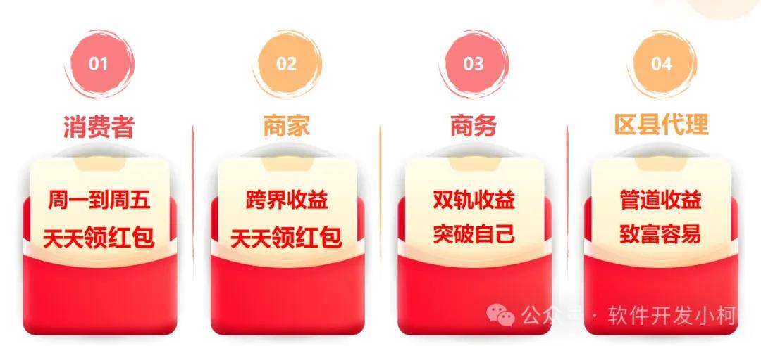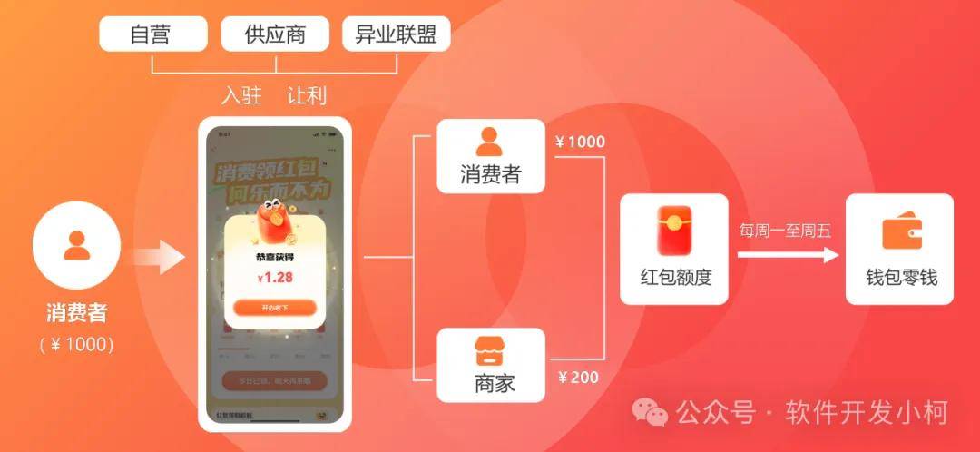 1. 用户:在合作商家消费,次周开始每周一到周五领红包,对于消费者是花钱的能通过抽奖返现赚钱,Zui高能把消费金额全部领回来,Zui关键的是红包直接到微信零钱,不限原店使用,比如消费1000元,可能分20周领回1000元红包,相当于"免费购物",并且平台会放出一部分优惠券,用户复购率提升50%-60%。