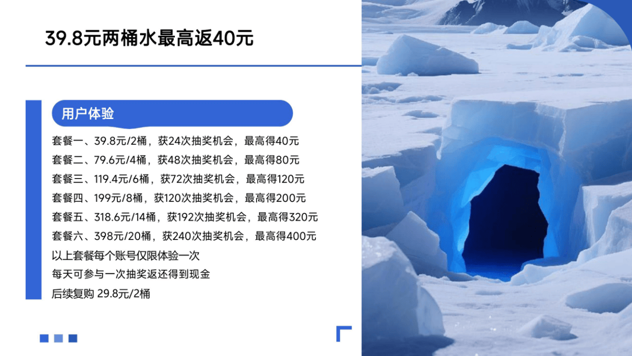先说说它Zui核心的玩法,看着特简单:花 39.8 元买一箱 24 瓶水,之后一年有 24 次抽奖机会,抽完能把 39.8 元全返回来,相当于免费喝一年水。别小看这规则,里面全是行为经济学的门道,每一步都踩在了用户心理上。