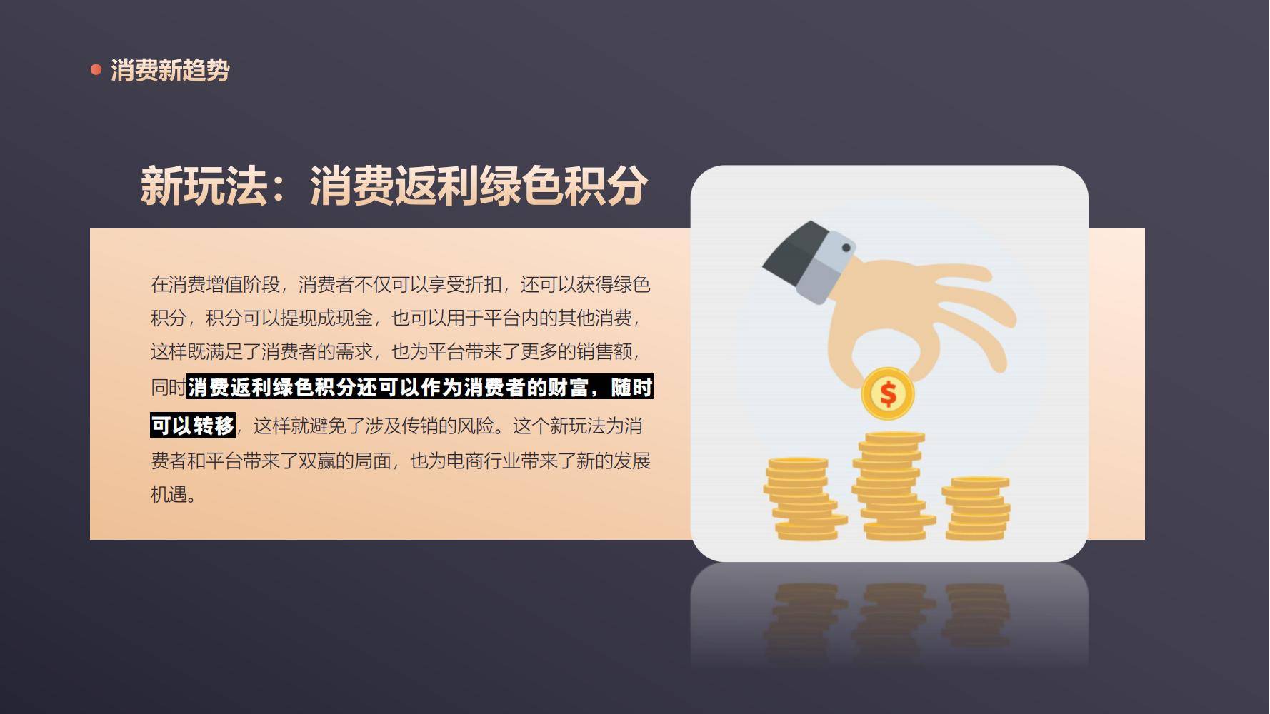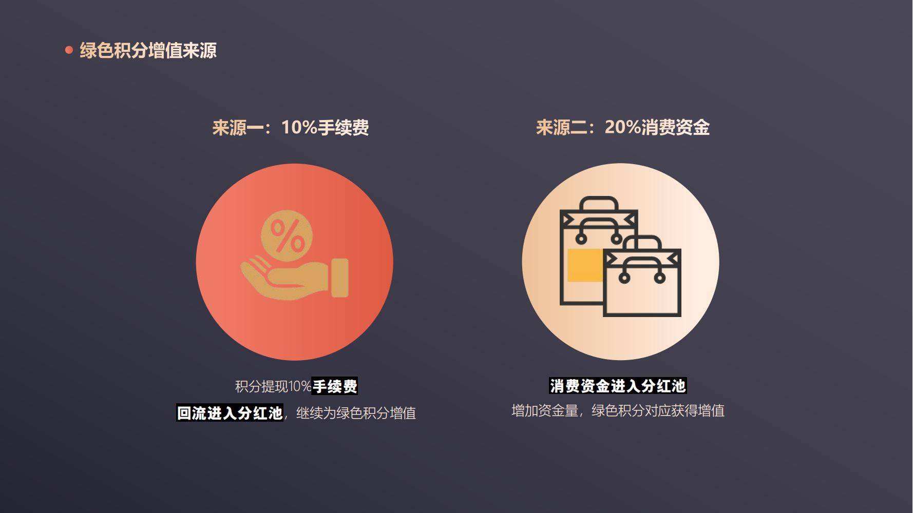 核心运行机制:消费者完成消费行为后,平台按规则返还可增值绿色积分;积分以资金池为价值锚点,随资金池规模扩大实现持续升值;zui终消费者可将增值后的积分提现,或用于平台再次消费,实现“消费不亏反增”,同步达成用户留存、GMV持续增长、平台自循环生态构建的多重目标。
