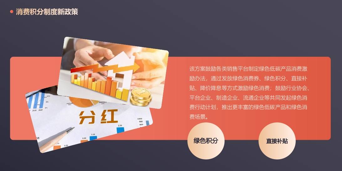 国家《促进消费实施方案》中,首次以正式政策形式明确“消费返利积分”的合法性与可行性,并明确鼓励各类经营平台发放绿色积分、绿色消费券及直接补贴,为积分增值模式提供了明确的政策支撑。