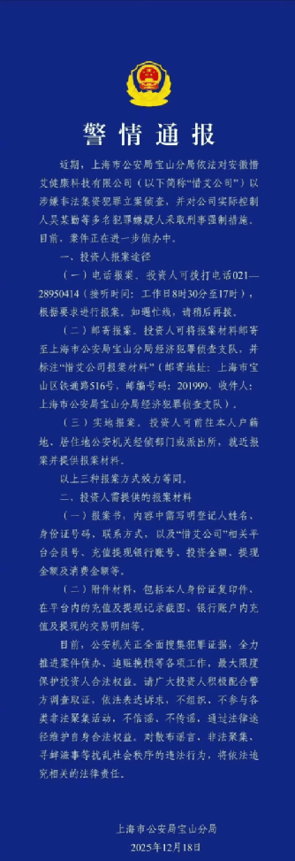 2025 年 12 月 18 日,上海宝山公安一则通报击碎了 70 万投资者的幻梦 —— 安徽惜艾健康科技有限公司(“艾兴合” 平台运营主体)因涉嫌非法集资被立案侦查,实际控制人吴凤勤(通报中称 “吴某勤”)及核心团队被抓。警方同步开通线上线下报案通道,全力追查证据与赃款,但此刻更荒诞的一幕正在上演:不少用户围堵警局 “求放吴凤勤”,他们坚信 “老板出来就能重启项目回款”。