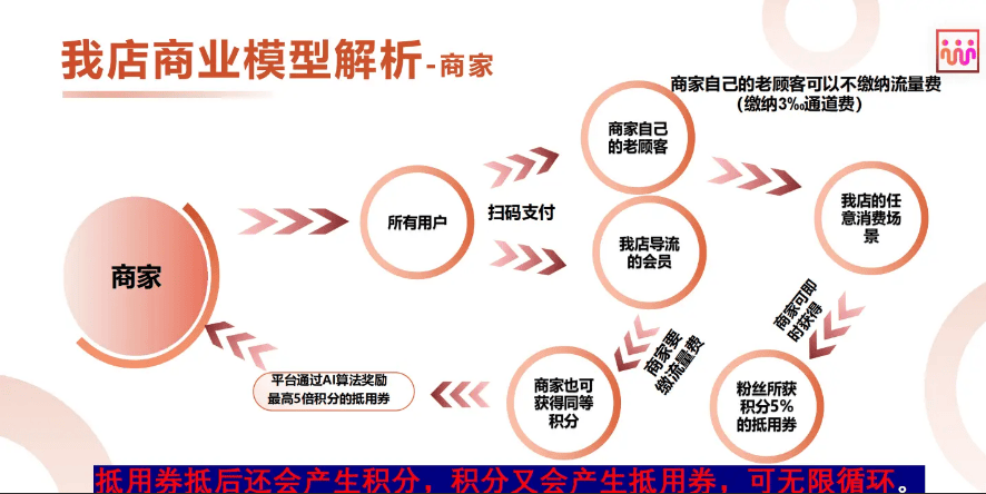 别觉得只有消费者占便宜,合作商家也不吃亏。商家给消费者让多少利,平台就会给商家对等的积分 —— 比如商家给消费者 20 个积分,平台也会额外给商家 20 个积分。